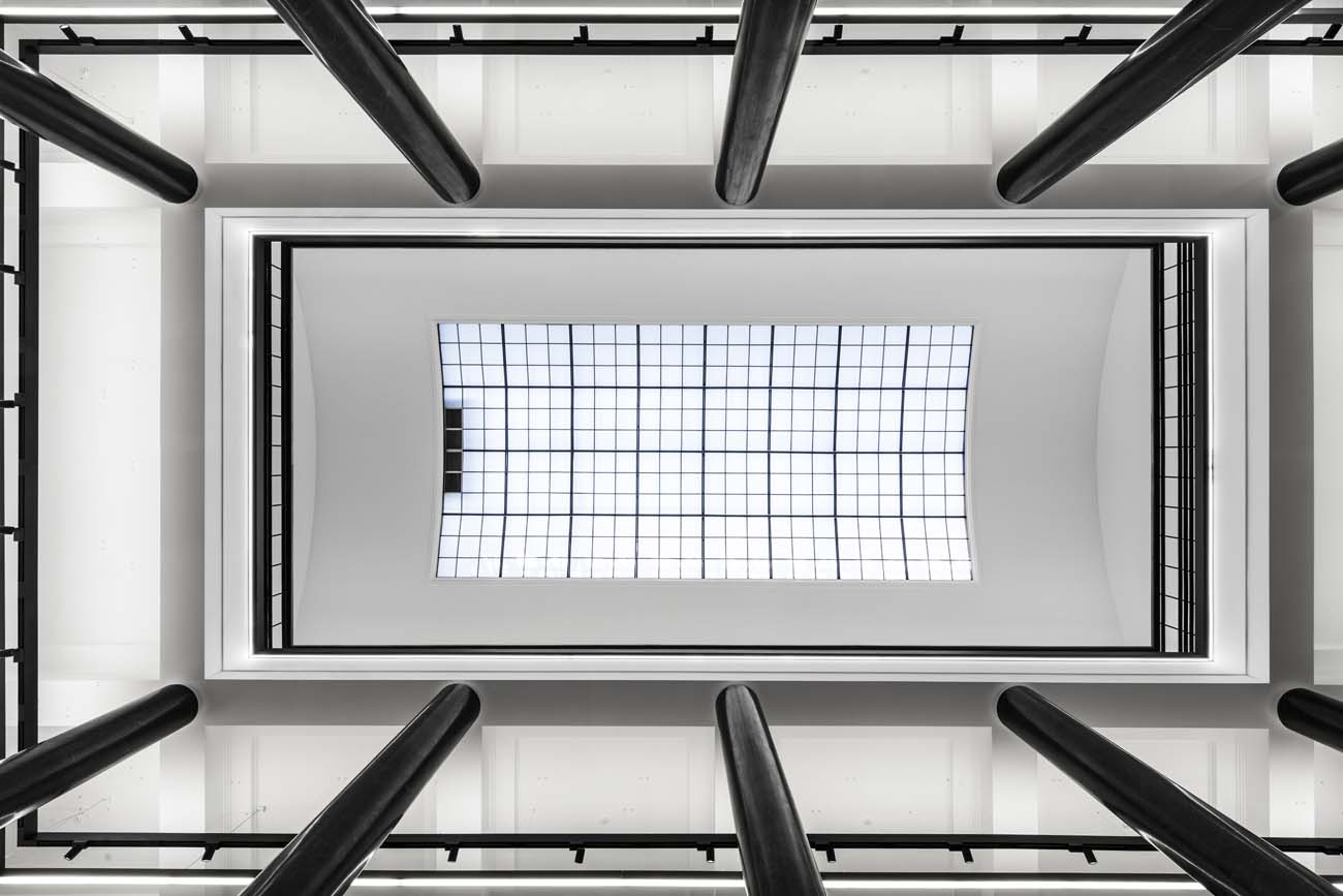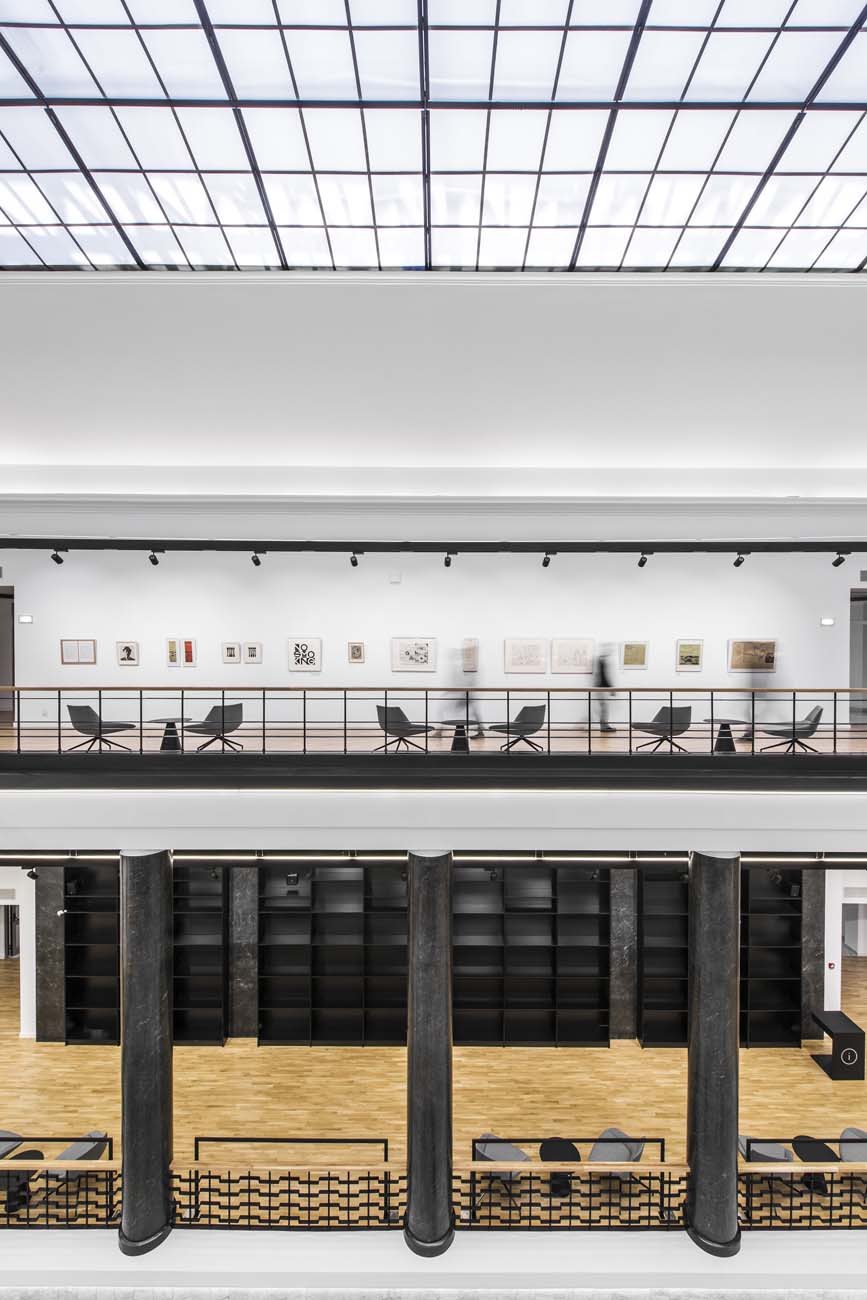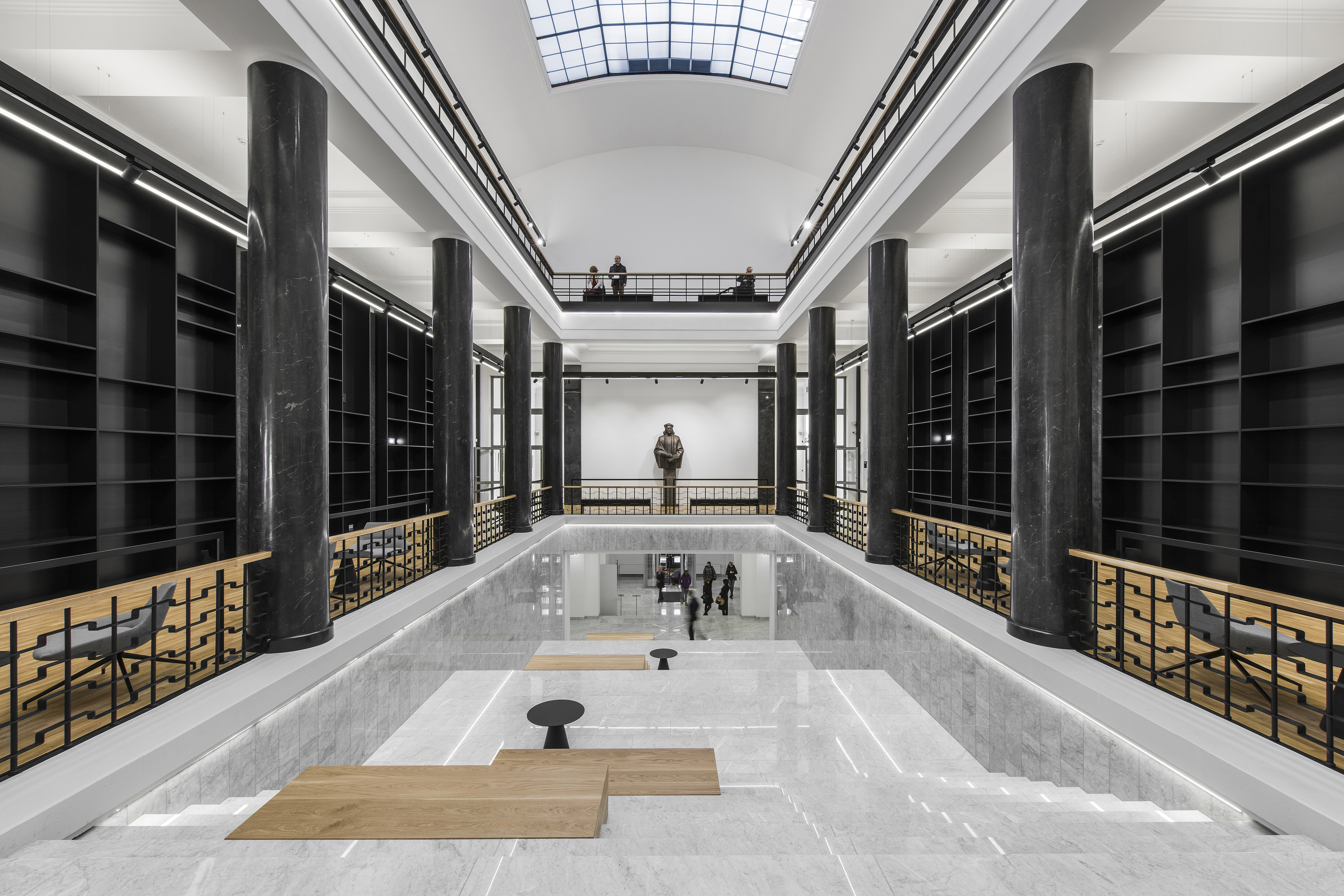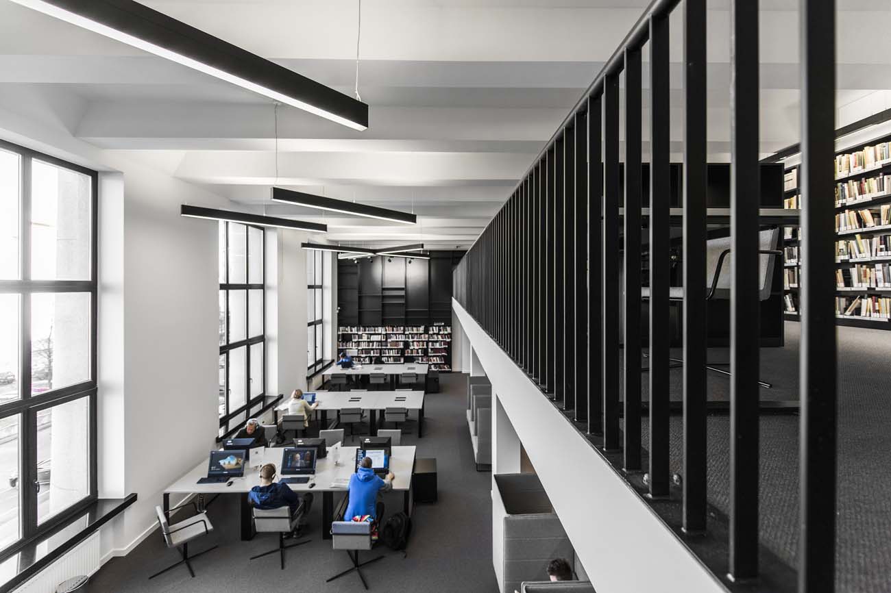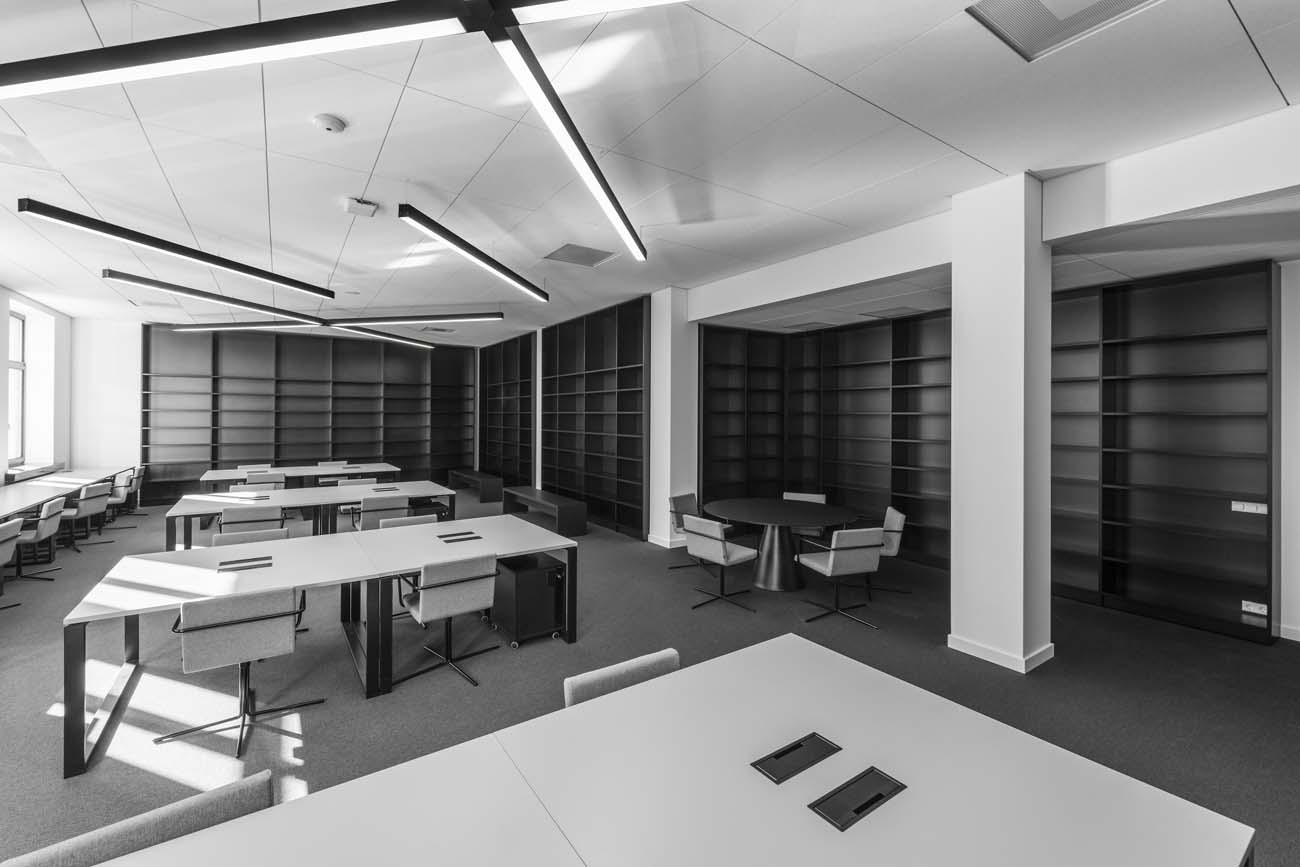 Kuriant Lietuvos nacionalinės bibliotekos interjerą, didelis dėmesys buvo skirtas interjero estetiniams sprendimams, pabrėžiant seno su nauju santykį. Taip atsirado vientisa, moderni baldinė struktūra, formuojanti naują bibliotekos veidą. The new interior design for the Martynas Mažvydas National Library of Lithuania was created in the context of the renovation of the building which was originaly constructed in 1963. Many elements including interior spaces, plan structure, interior elements and finishing materials are protected by strict heritage regulations. Therefore the interior spaces essentially were left intact, many interior elements and materials were restored or recreated. Many new functions were introduced within the existing spaces that are arranged throughout the six floors of the building. New functional zones include few hundred working spaces for visitors, spaces for co-working, coffee shops, conference room, galery, recording studio, cinema room, arts incubator, daycare centre and more. A lot of attention was dedicated to the aesthetical solutions highlighting the relation between “the old“ and “the new“. As a result a modern homogenous structure of interior elements was created which forms a new identity for the library.