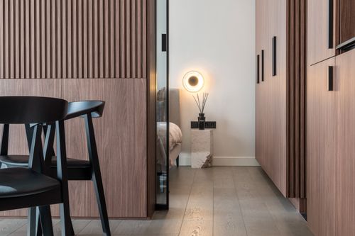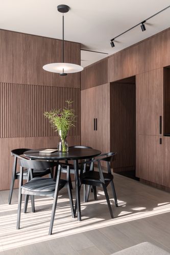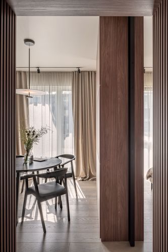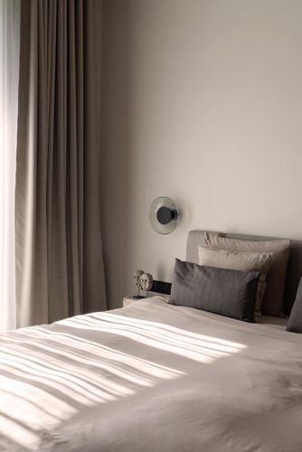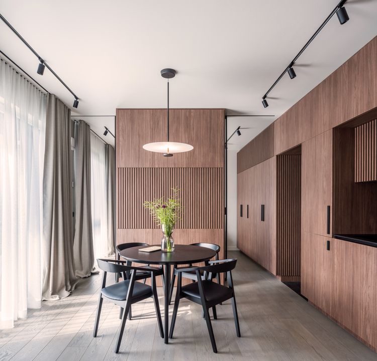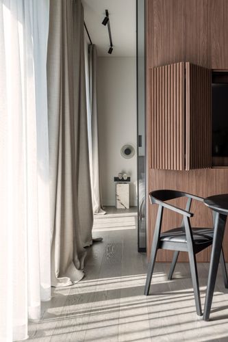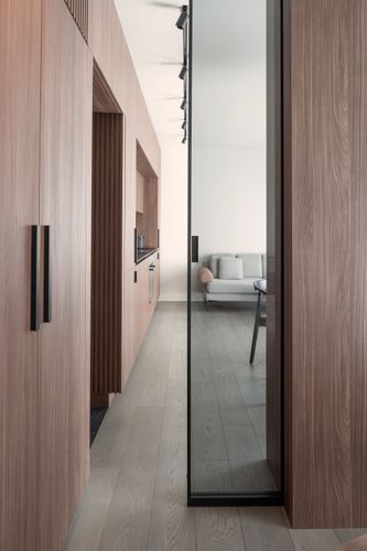41 m2 buto planas gimė ieškant būdų kaip maksimaliai padidinti gyvenamąsias erdves ir sukurti daug daiktų pasidėjimo vietų. Tiek tūriškai, tiek funkciškai butą padalinome į dvi zonas. Jas perskyrėme dideliu visą butą kertančiu baldu. Vienoje zonoje suplanavome tambūrą su įeinama drabužine ir vonios kambariu, o kitoje - miegamąjį ir gyvenamąją erdvę su virtuve. Antras svarbus kompozicinis elementas - laisvai stovinti tv spinta, skirianti miegamojo ir gyvenamąją zonas. Jos pagalba pavyko vizualiai pratęsti erdvę, kuri tuo metu naudojama, tačiau funkciškai atskirti nesujungiant miegamosios ir valgymo zonų. Norint jas atitverti, suprojektavome balde paslėptas dvejas stumdomas duris.