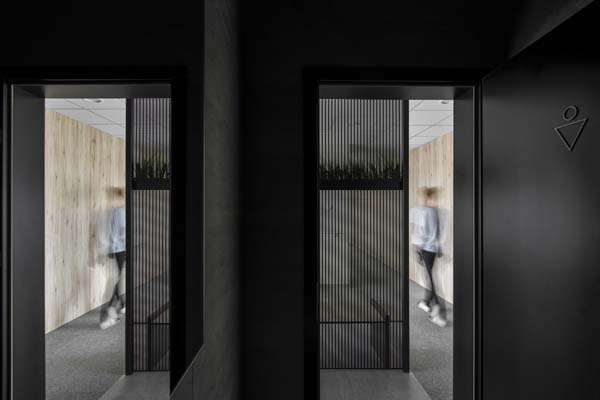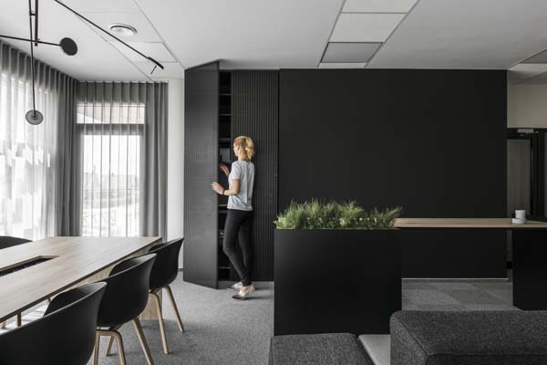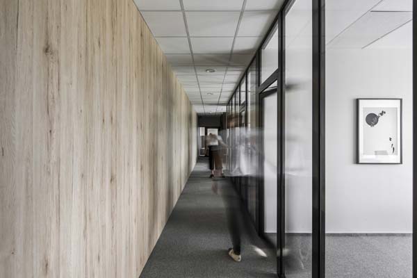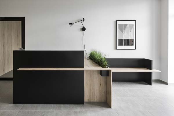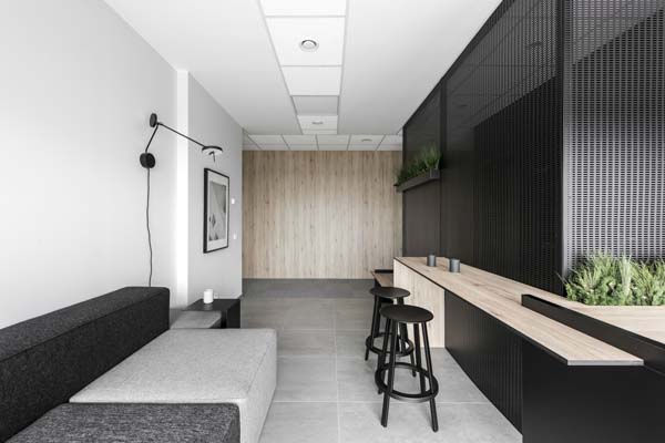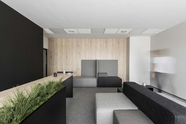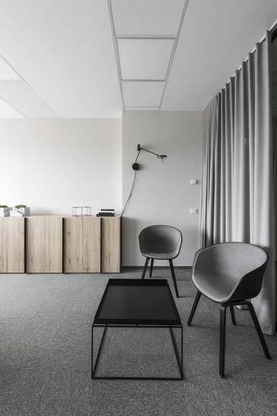 Biuro atmosfera- namai. Tai vieta, kur dirbantys žmonės praleidžia daug laiko, todėl aplinka primena namus: čia gausu kilimų, užuolaidų ir darbuotojai čia avi šlepetes. Dirbantiems žmonėms suplanuotos erdvės poilsiui, valgymui, individualiam darbui ar kolektyvo susibūrimams. 400m2 biuro interjerui pasirinktos kontrastingos medžiagos-betonas, akmens masės plytelės, perforuotas metalas konkuruoja su medžio paviršiais, kilimine danga, tekstile. Baltas plokštumas atspindi juodos. Santūrų koloritą papildo žali augalų elementai. Office „Katalita“ The atmosphere of the office reminds home. IT is a place where employees spend a lot of time, therefore it feels like at home: a lot of carpetings and curtains; employees wear slippers in here; special resting areas are planned out for eating, individual work of team meetings. Contrasting fabrics were chosen for the 400m2 office space: concrete, stone mass tiles, carpeting, textile fabrics and perforated metal which competes with natural wood surfaces. White surfaces are reflected by black ones. Modest colors are supplemented with green plant elements.