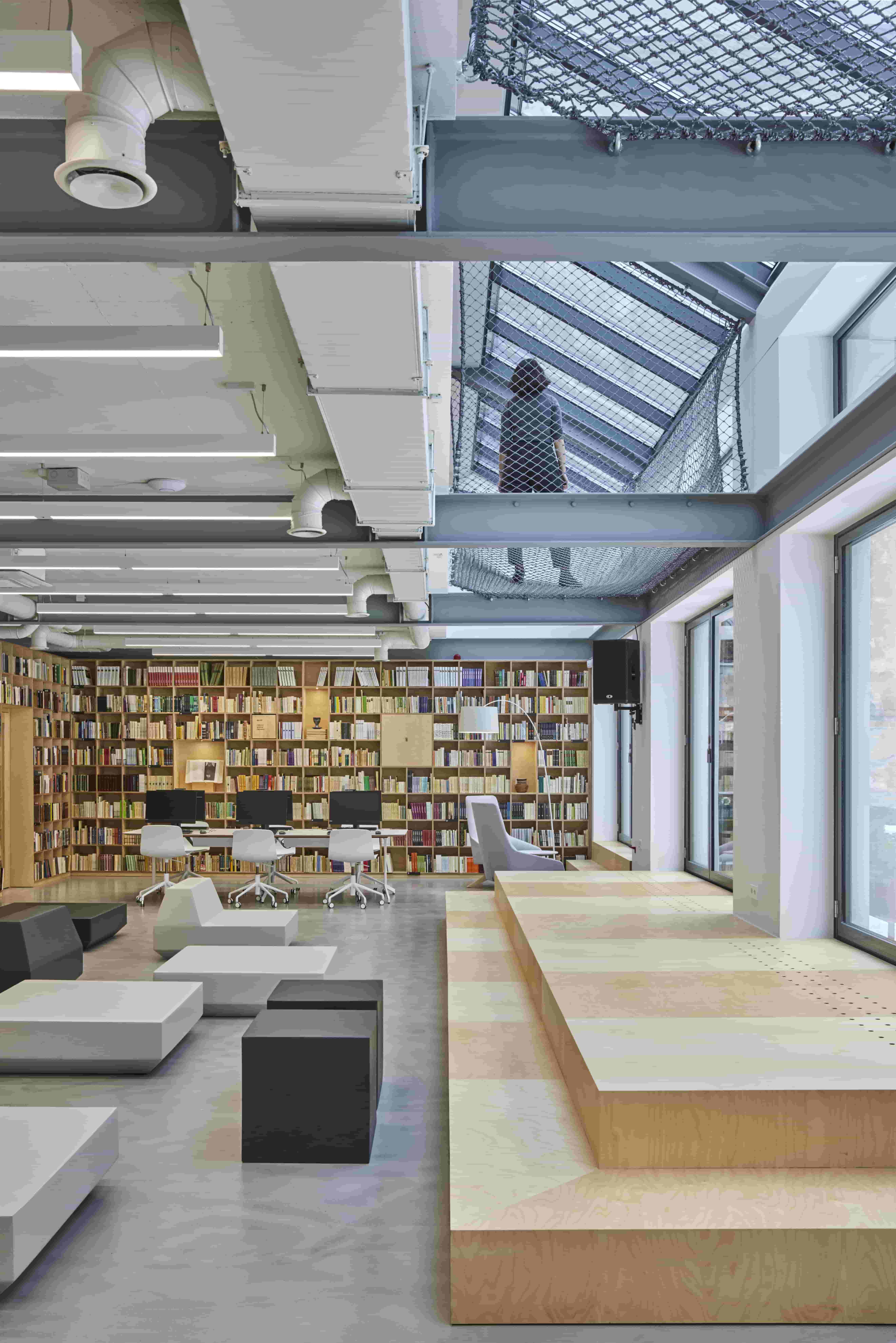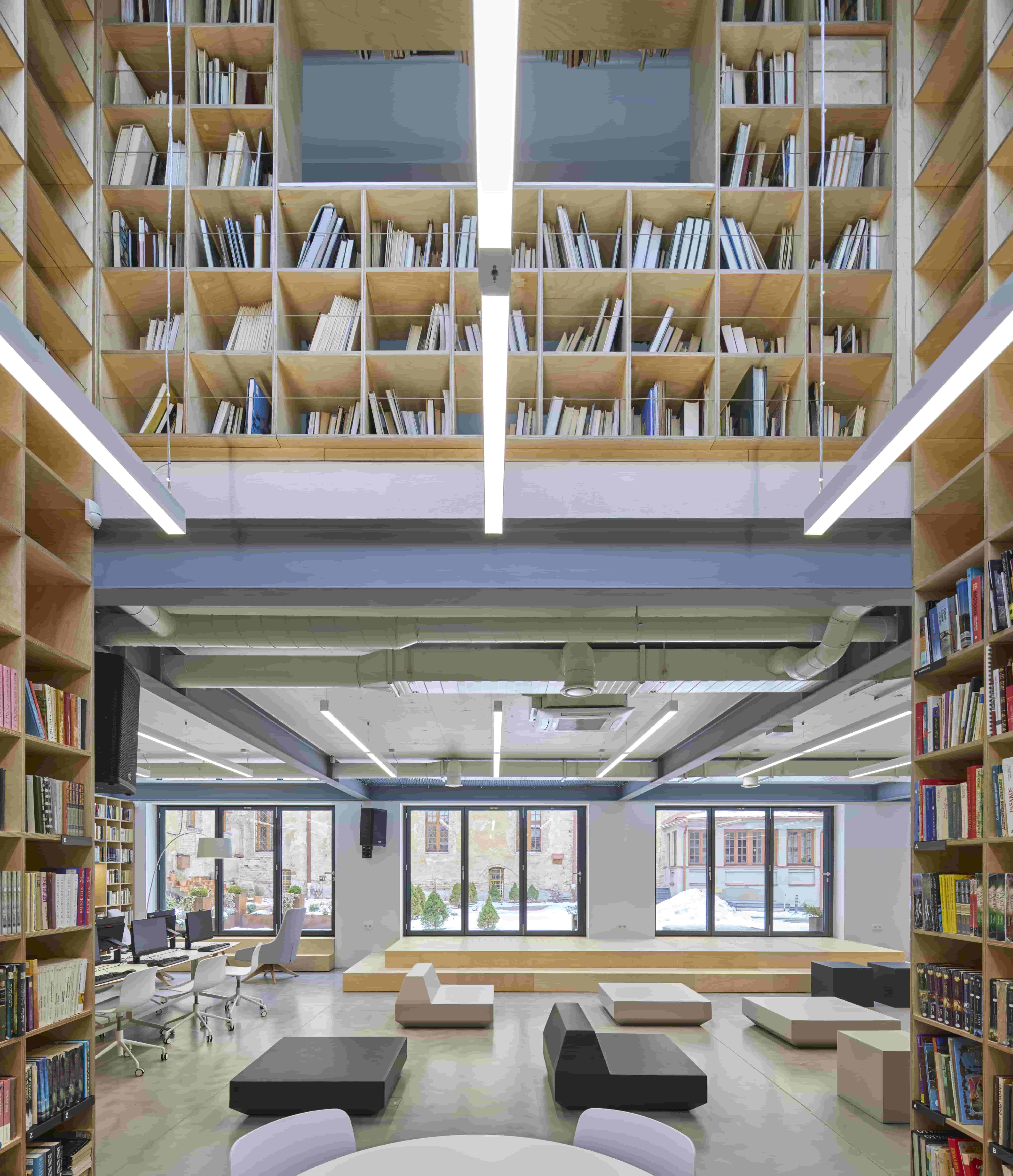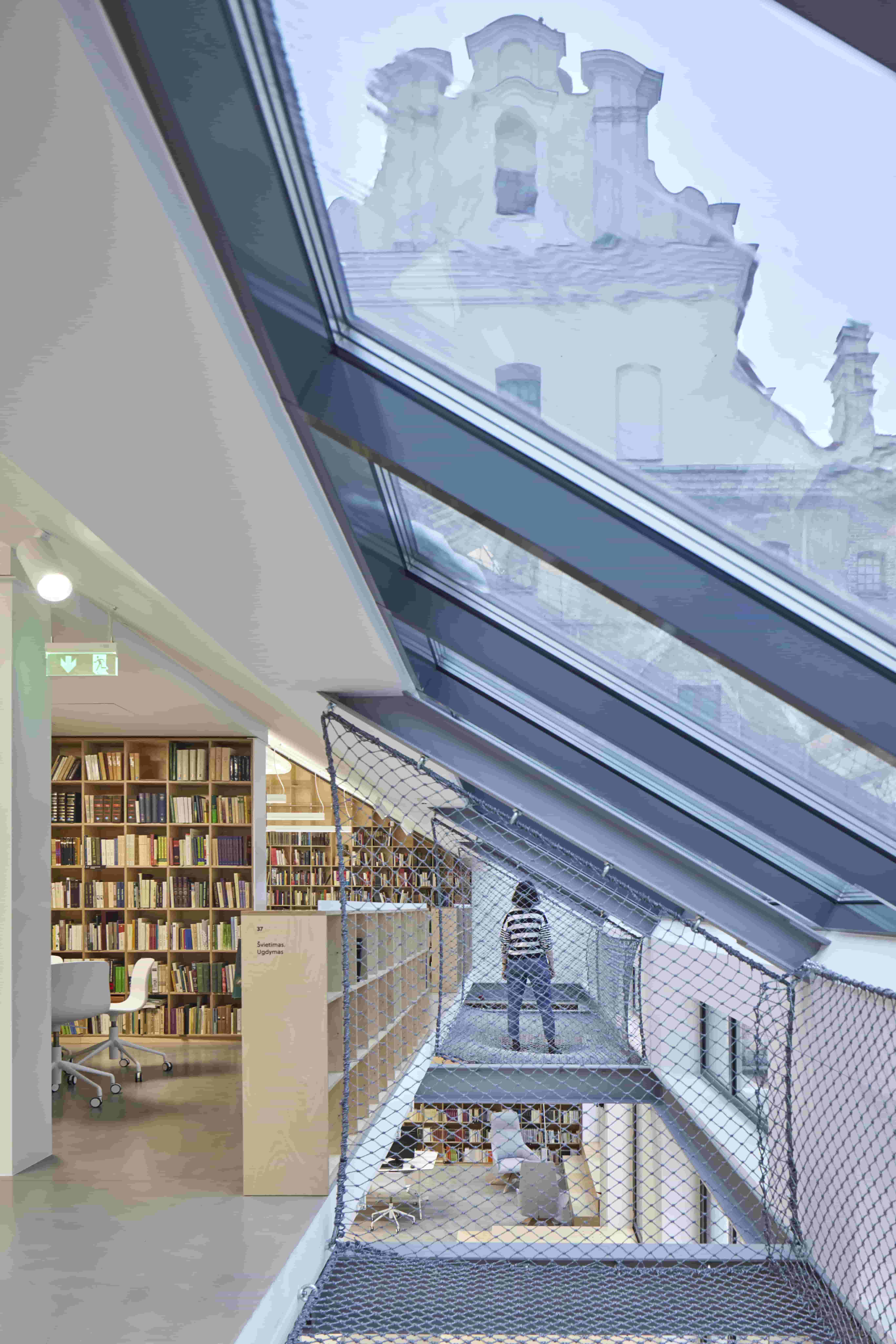 Lojoteka. Edukacinis medijų centras – šiuolaikiška pažinimo ir edukacinė erdvė, skirta gimnazijos bendruomenei ir visuomenei. Lojoteka išplečia tipinės mokyklos bibliotekos ribas – tai moderni, kūrybiškumą skatinanti pažinimo ir edukacinė erdvė. Medijų centre yra knygų saugykla, skaitykla, konferencijų, susitikimų, laisvalaikio erdvės, garso ir vaizdo įrašų bei fotografijos studijos, jaukios individualių ir grupinių darbų patalpos, Jėzuitų bibliotekos fondų katalogo saugykla, lauko terasa.Tai moderni, atvira ir funkcionali erdvė, lengvai pritaikoma individualiam ar grupiniam ugdymosi procesui, edukaciniams eksperimentams, jaukiems susibūrimams, saviugdai, bendravimui ir turiningam laisvalaikiui. Lojoteka. This Educational Media Centre provides a modern cognitive and educational space for the gymnasium community and related public. Lojoteka expands the boundaries of a typical school library, being a modern cognitive and educational space that promotes creativity. The media centre comprises a book depository, a reading room, spaces for conferences, meetings and leisure, audio, video and photography studios, cosy rooms for individual and group work, the Jesuit Library's catalogue room as well as an outdoor terrace. It is a modern, open and functional space easily adjusted for individual or group learning process, educational experiments, cosy gatherings, self-development, communication and meaningful leisure.