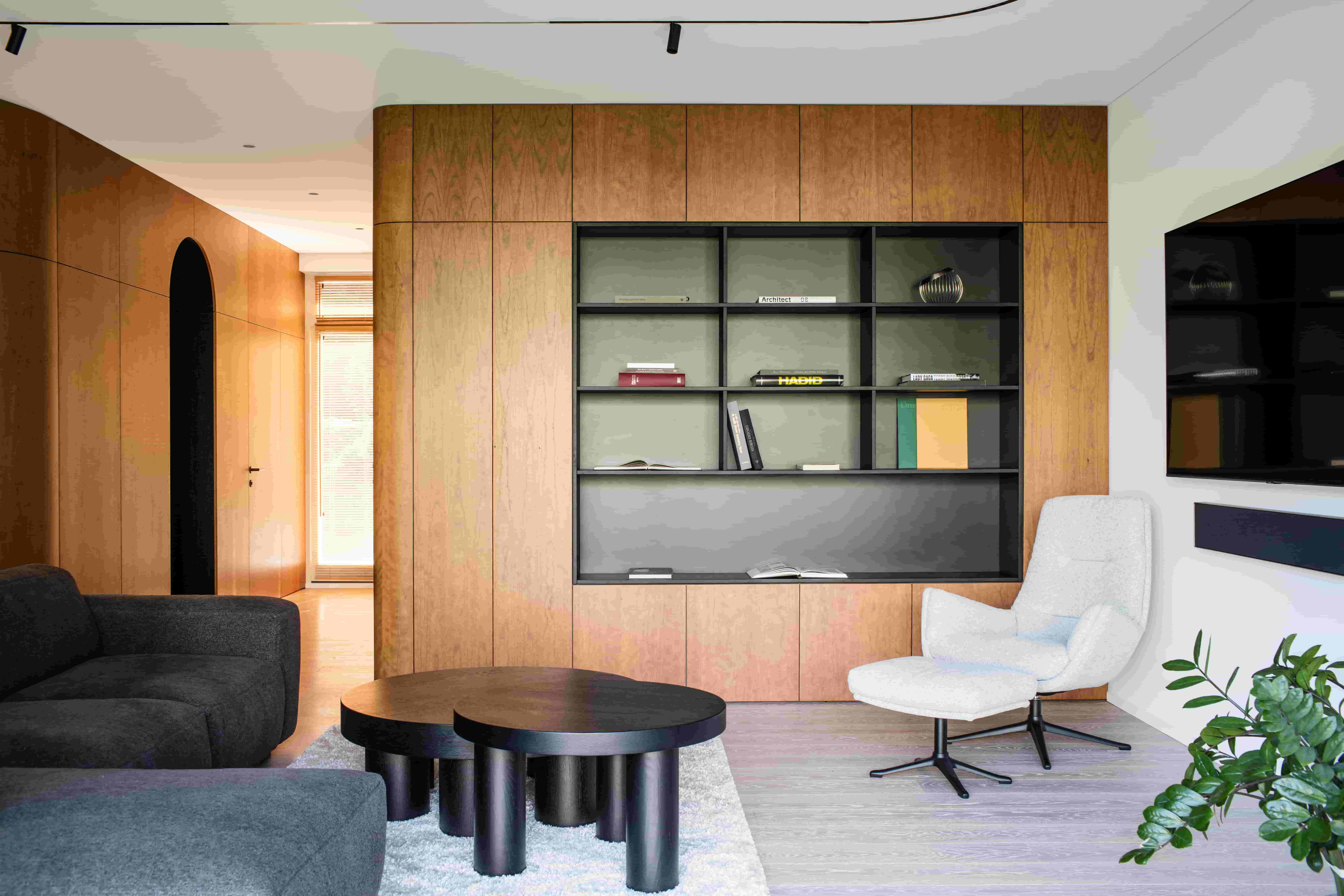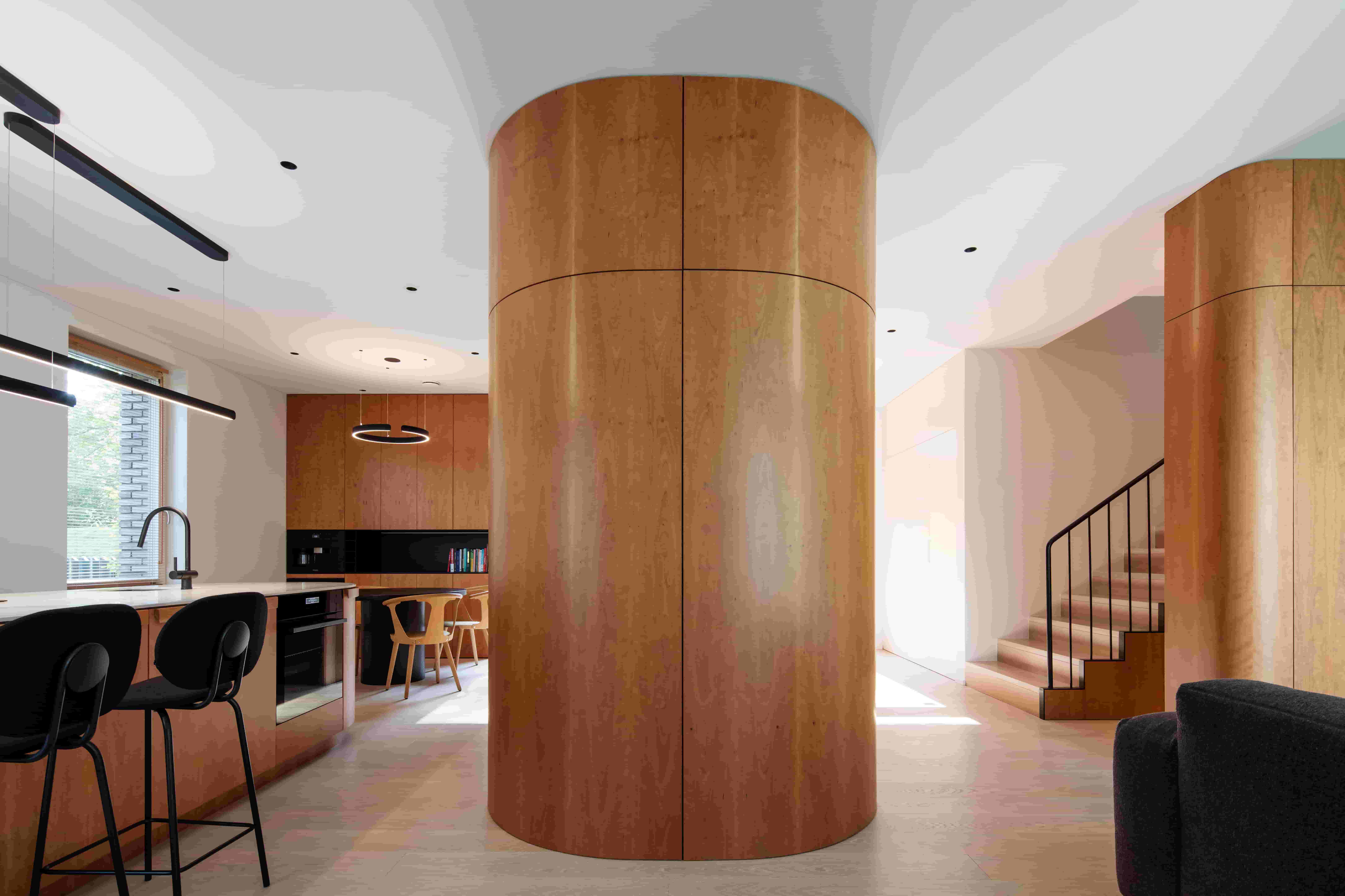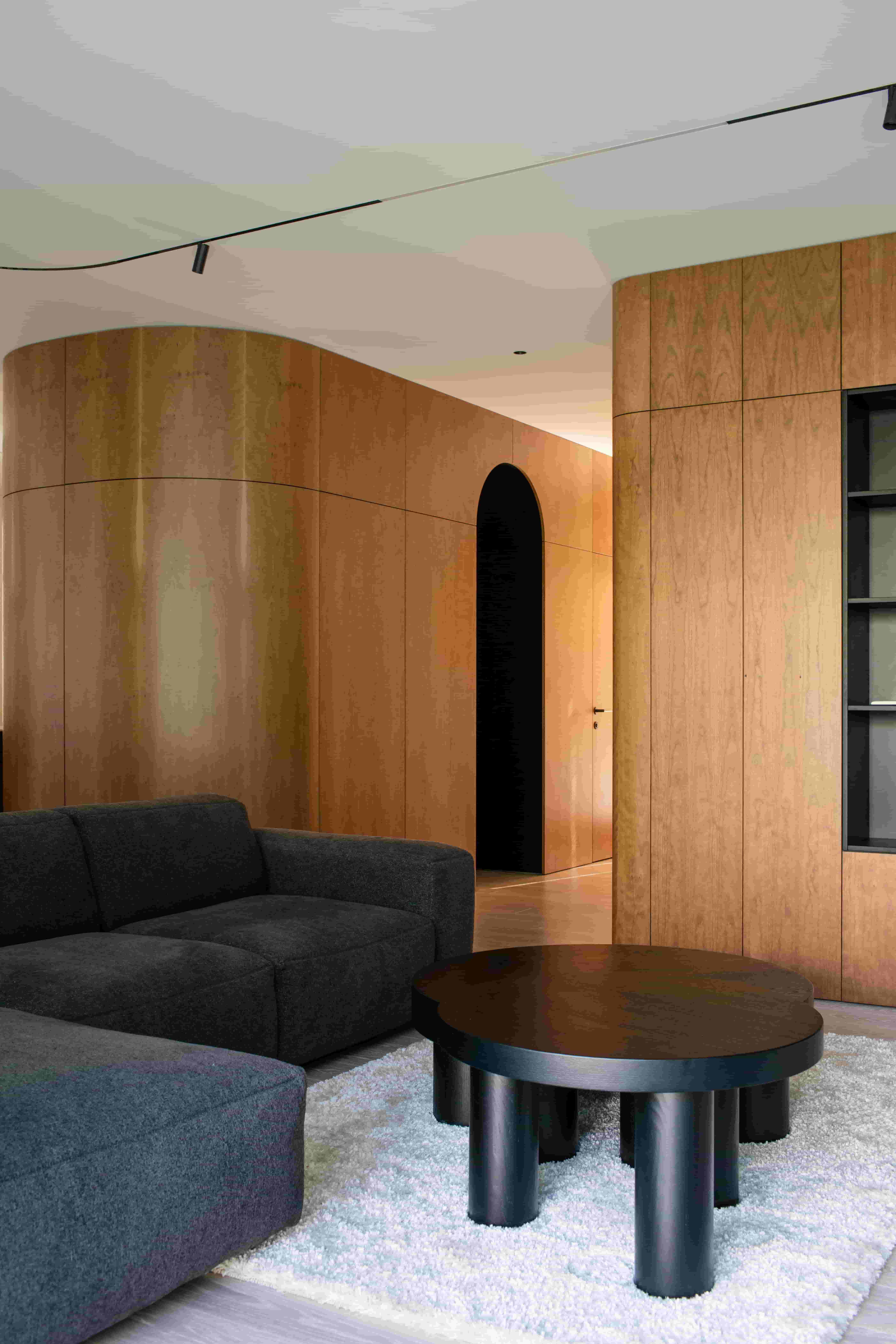 Šį interjerą charakterizuoja du pagrindiniai bruožai - ryški medžio spalva ir lenkta linija. This interior is characterised by two main features - bright color of the wood and rounded lines.