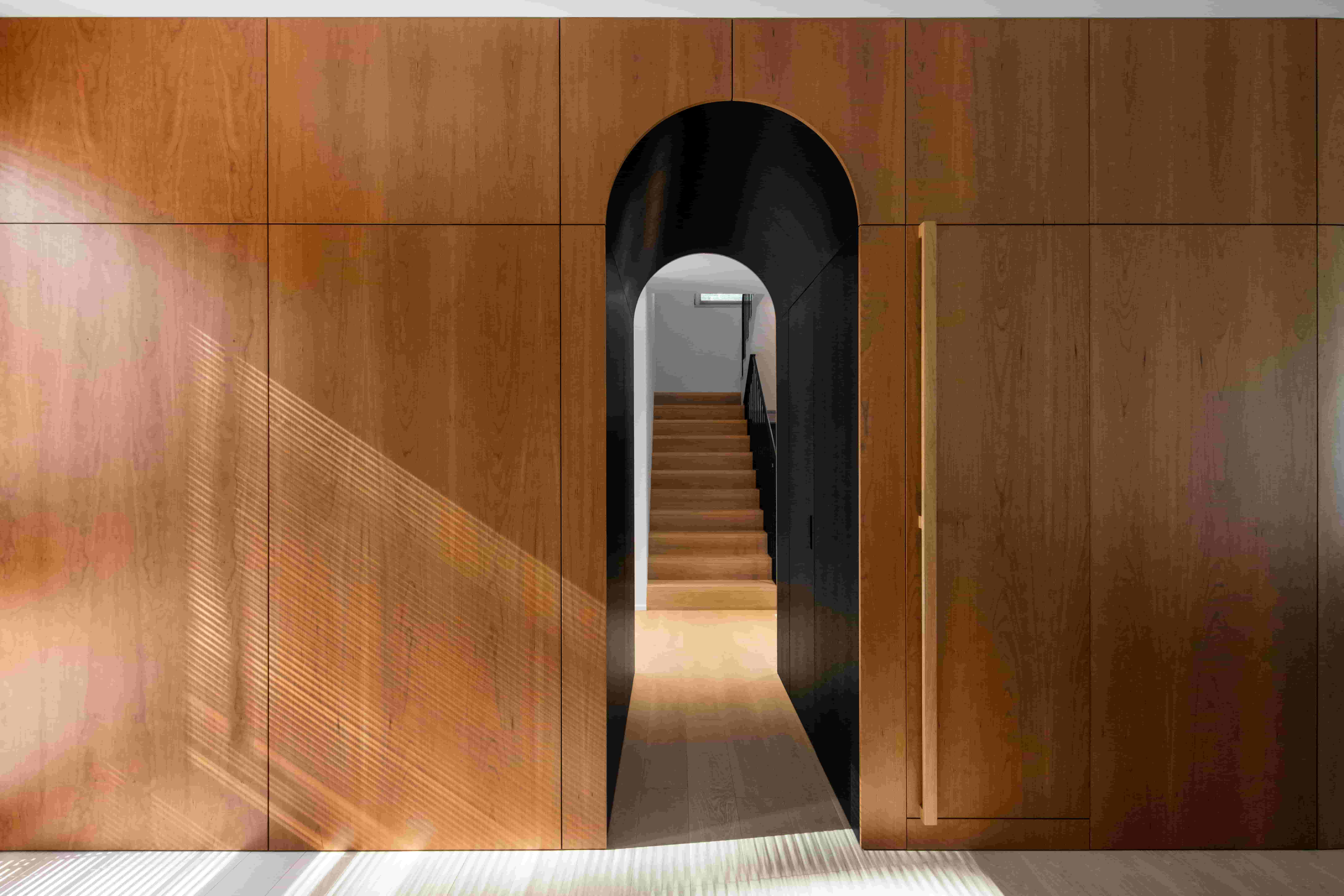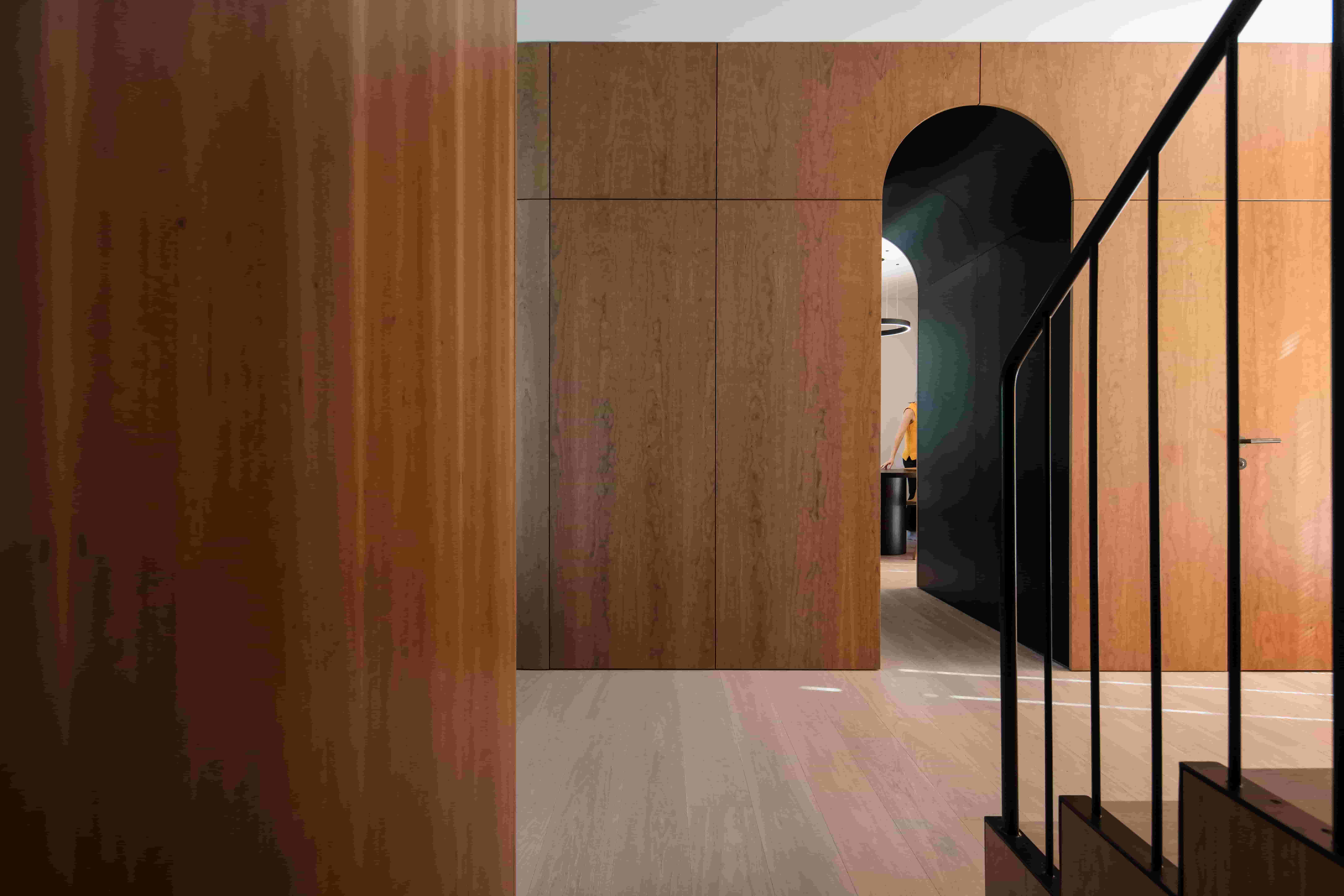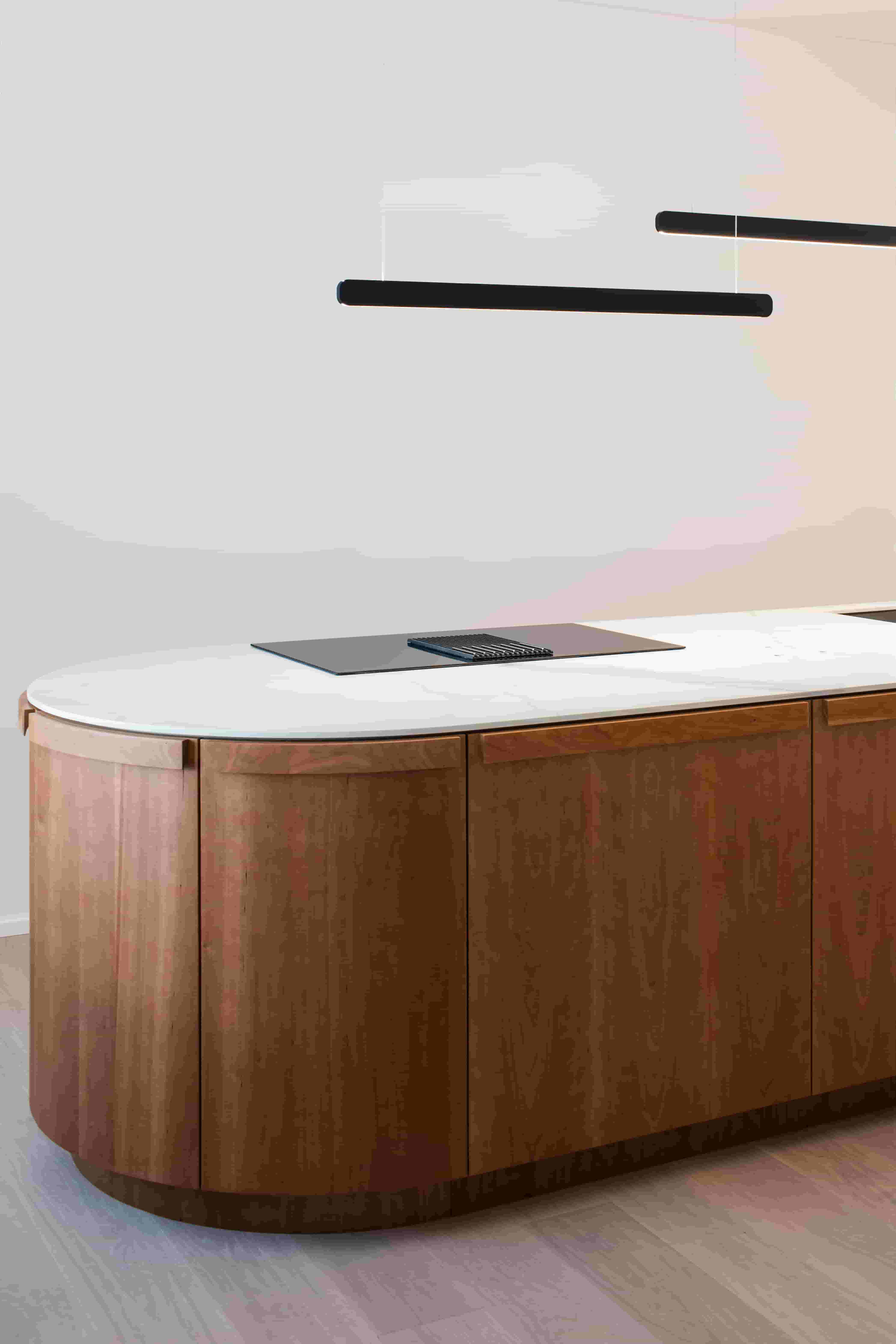 Šį interjerą charakterizuoja du pagrindiniai bruožai - ryški medžio spalva ir lenkta linija. This interior is characterised by two main features - bright color of the wood and rounded lines.