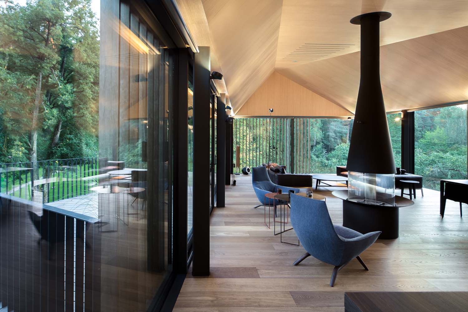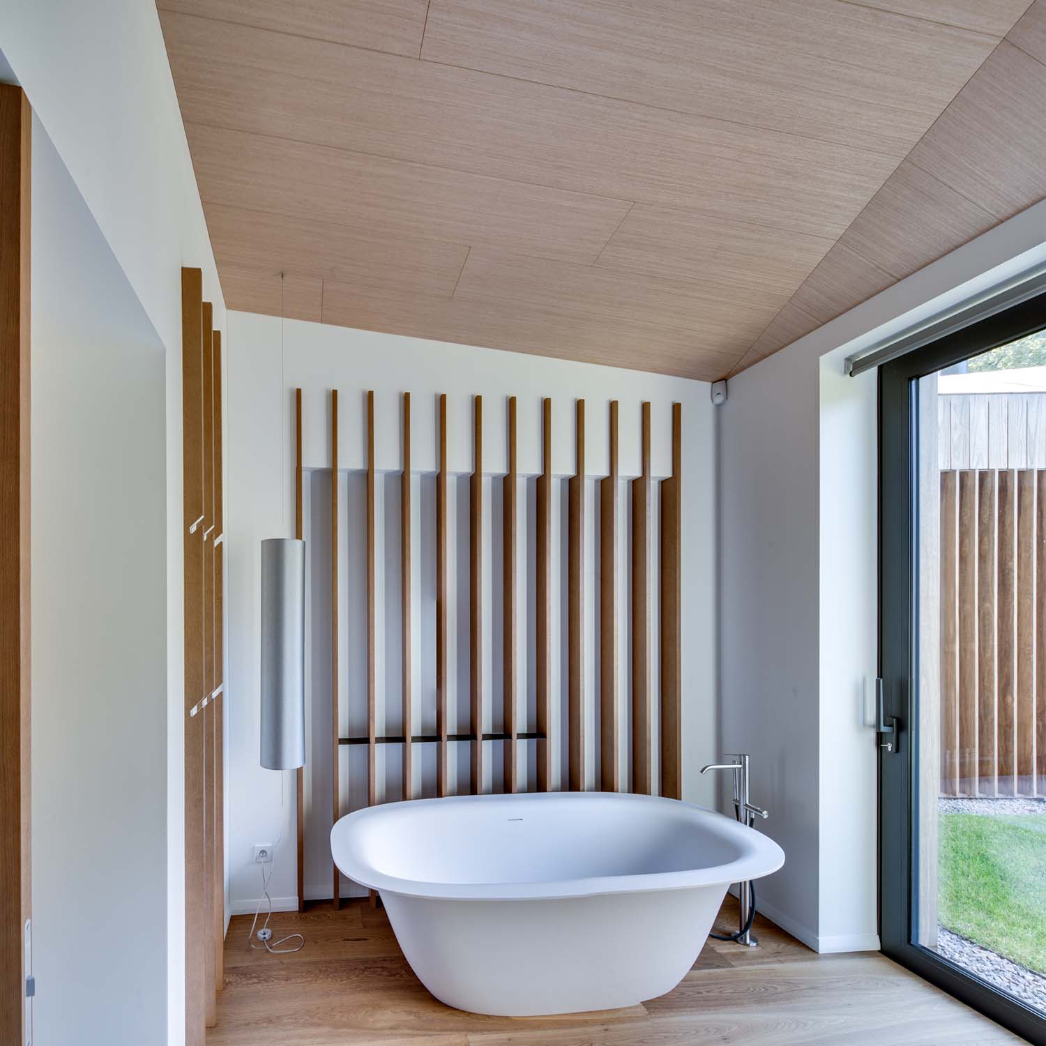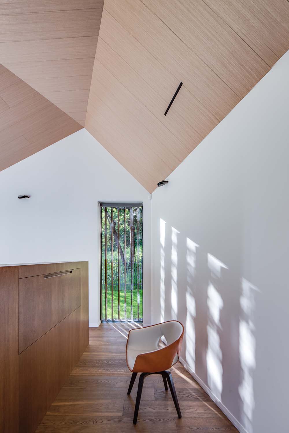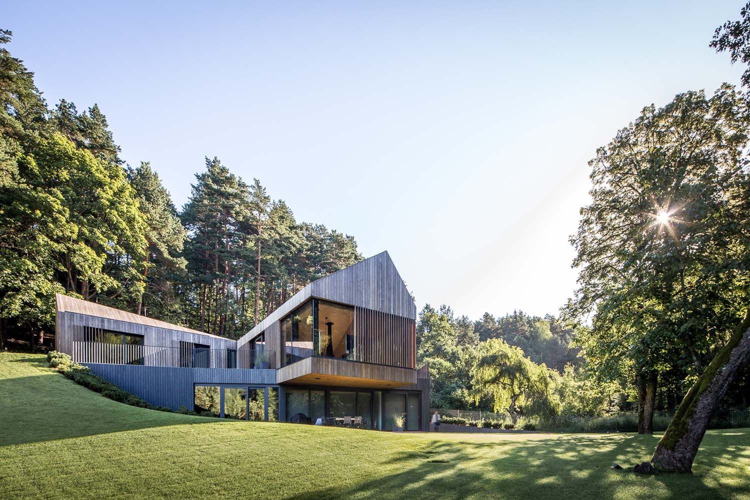 Vos keli šimtai metrų nuo judrios miesto gatvės, ir tu jau malonioje parko aplinkoje, šalia natūralaus slėnio. Regioninio parko teritorijoje galiojantys architektūrinės raiškos apribojimai ir užsakovų vizija gyventi moderniame name – taip prasidėjo šio namo kūrimo istorija. Naujas tūris buvo suprojektuotas buvusios sodybos vietoje, bet preciziškai išsaugotas šlaitas ir visi sklype augantys medžiai. Pastatas tarsi pakibo virš slėnio, atsiverdamas į jį ištisomis vitrinomis. Cokolinis aukštas pasislėpė šlaite – dėl juodų skalūnų apdailos jis lyg išnyko pamiškės šešėlyje. Lakoniška namo tūrių forma interpretuoja tradicinio dvišlaičio namo siluetą. Tai namas gamtoje, todėl visos pagrindinės patalpos turi išėjimą į lauko erdves – kiemus. Harmonija.