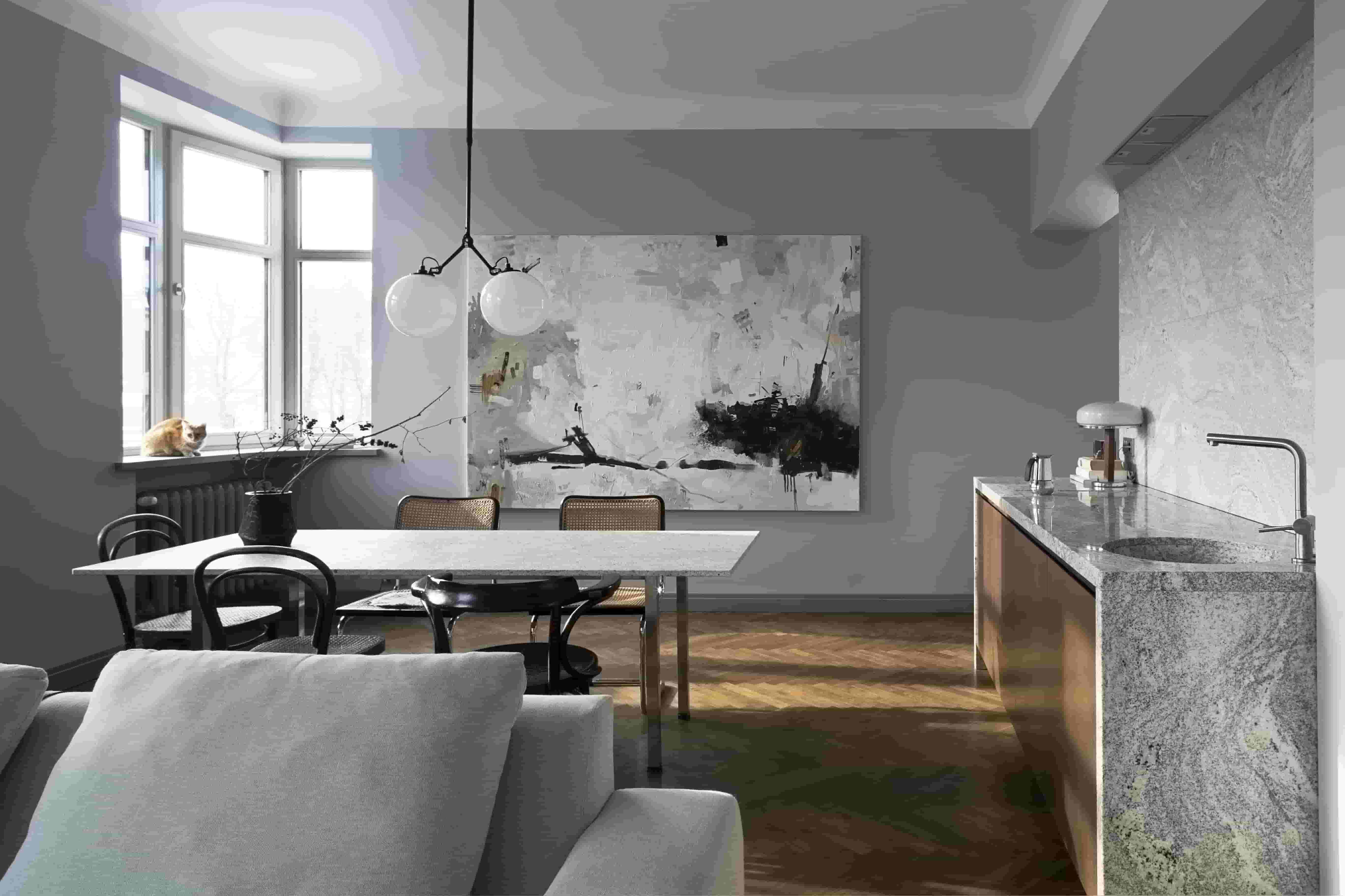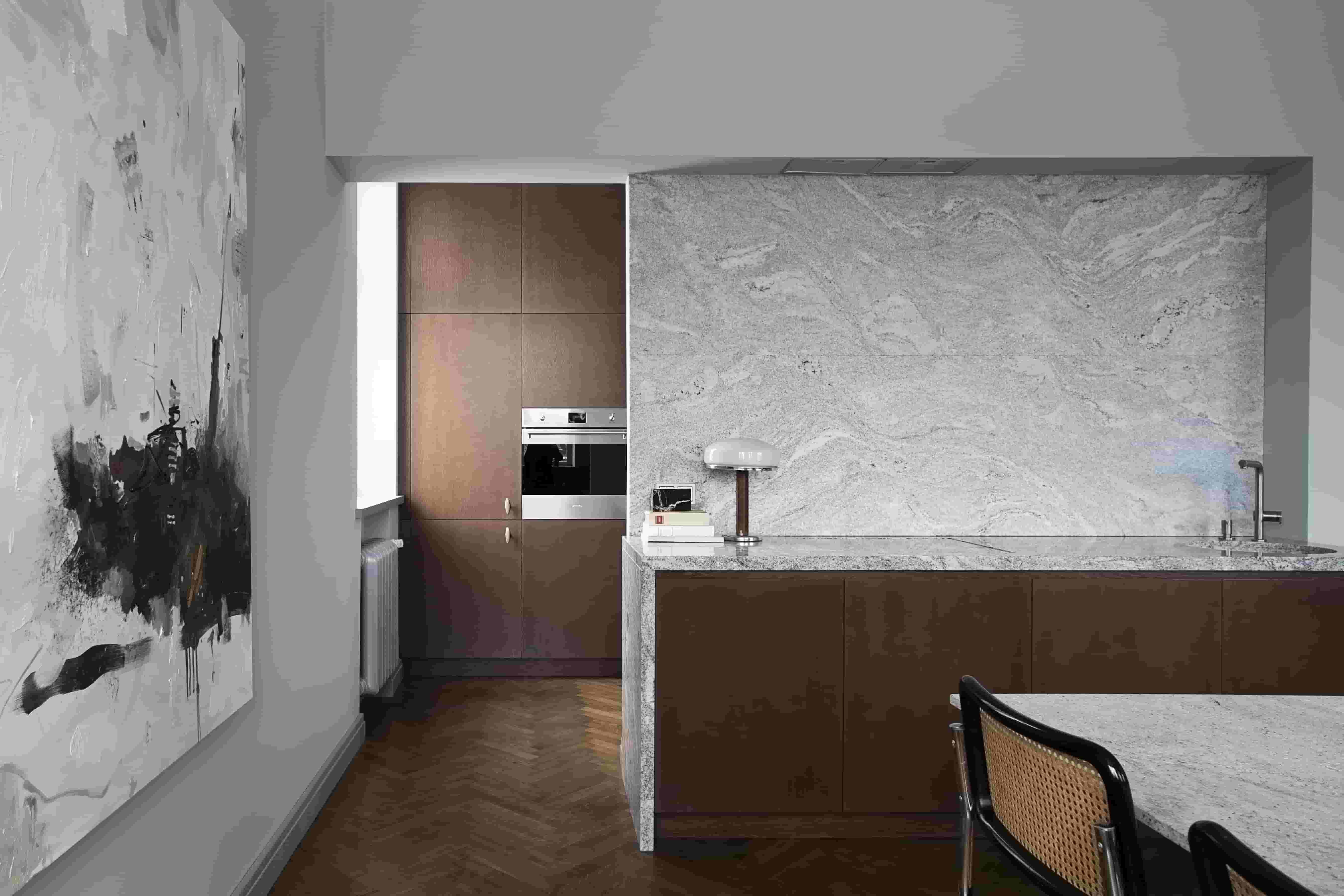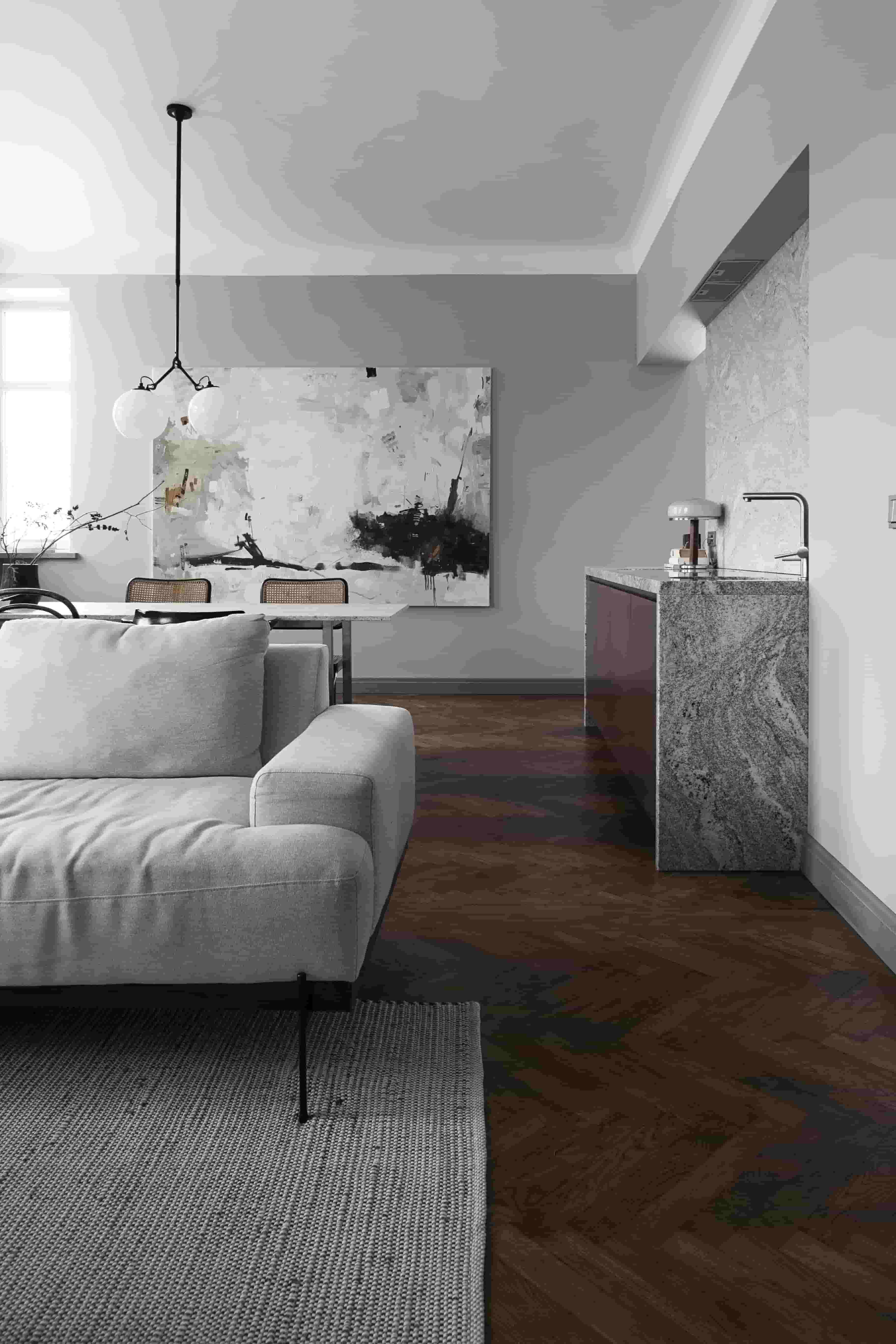 Butą Kauno Naujamiestyje K. Donelaičio gatvėje esančiame 1932 m. tarpukariniame pastate prikėlėme naujam gyvenimui. Nors butas jau turėjo autentišką išplanavimą, buvo stengtasi jį pritaikyti šeimai ir funkciškai teisingai išdėlioti erdves. Užduotis buvo nelengva, nes tuo pačiu norėjosi išsaugoti daug paveldo elementų. Turėjome tikslą, kad namo kontekstas atsispindėtų ir viduje. Nors ir buvo restauruotas autentiškas parketas, pasirinkta tamsi jo spalva, kuri primena, jog šiam namui beveik šimtas metų. Akcentavome ir lubose esančius užapvalinimus, tad buvo nuspręsta sienas ir lubas dažyti konstrastingomis spalvomis. Bute formuojama erdvi svetainė, jos pagrindinis akcentas – ilgas valgomojo stalas, ir už jo kabantis didelio formato paveikslas. Bute norėjosi išvengti tradicinės virtuvės išklotinės, todėl pasirinktas išskaidytos virtuvės principas. Frontalinė siena su granito apdaila sukuria vientisą vaizdą, kurio neskaido net virtuvinė technika - kaitlentės mechanizmas paslėptas po akmeniniu stalviršiu. Už sienelės suprojektuota virtuvės dalis su aukštomis funkcionaliomis spintomis. Bute pavyko pritaikyti ir autentiškus išlikusius elementus: atgaivinome senas ąžuolinio parketo grindis, restauruotos senos medinės durys, prikelti naujam gyvenimui autentiški radiatoriai, buvusių langų rankenėlės panaudotos naujuose balduose. Išsaugotos bute buvosios nišos ir angos, joms suteikiant naujas funkcijas. Interjere naudotos ilgaamžės medžiagos: natūralaus akmens apdaila vonios kambariuose, taip pat kaip grindų danga zonose, kur neišlikęs autentiškas parketas, virtuvėje - granito stalviršis su sienele. Virtuvės ir vonios kambario baldų fasadams pasirinktas natūralaus ąžuolo lukštas. Šiame bute labai svarbi visuma – ieškojimas santykio tarp seno ir naujo, modernaus ir autentiško. The apartment in an old modernist building in the historical part of town was brought back to life. The main goal of designing the apartment was to create a functional floor plan that would suit a contemporary family living scenario, while also paying homage to its authentic historical properties. The central piece of the spacious living area is the dining table that brings together family and friends. Behind it, hangs a large scale painting that brings the dining area into focus. The kitchen was decomposed into two different parts. The frontal counter space was left uncluttered. To achieve a seamless look with no visible kitchen appliances a custom made cooktop was cut from the same granite as the kitchen countertop. Floor to ceiling cabinetry that provides lots of storage space was concealed behind a corner. All of the authentic components of the 100 year old building were preserved to celebrate the authentic qualities of the apartment. Herringbone parquet floor and old wooden doors were carefully restored. Original heaters were refurbished and even old window handles were reused for newly designed furniture. A mix of timeless materials and colors were incorporated into the design to respectfully dialogue with the existing aesthetics of the building. Natural stone was used abundantly in the bathrooms and kitchen and all of the custom furniture was made of darkened oak. The final result is a contemporary dwelling that celebrates its historical character while accommodating a contemporary life and creating a new family history.