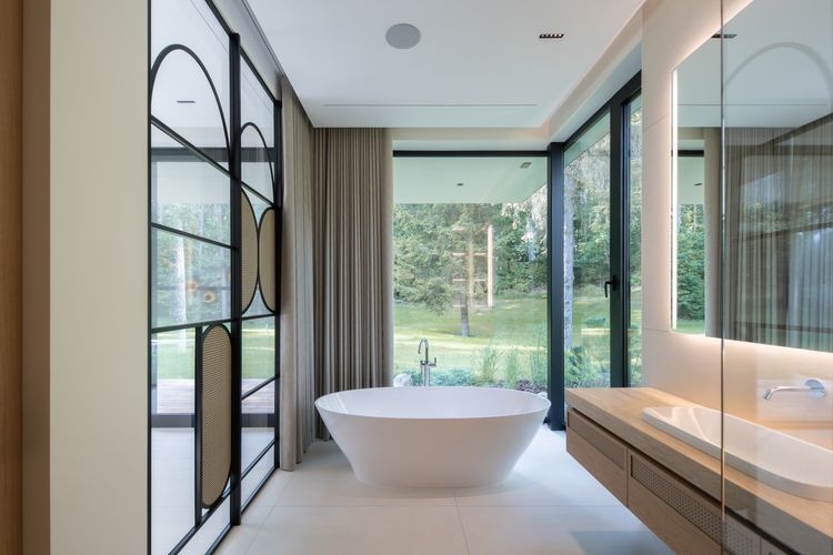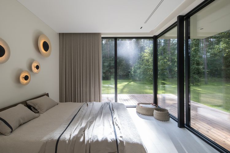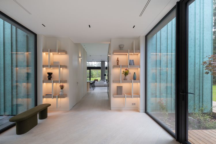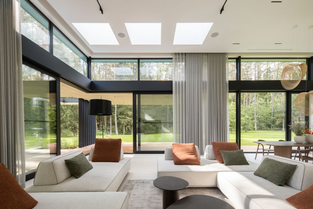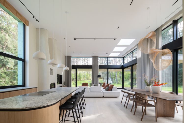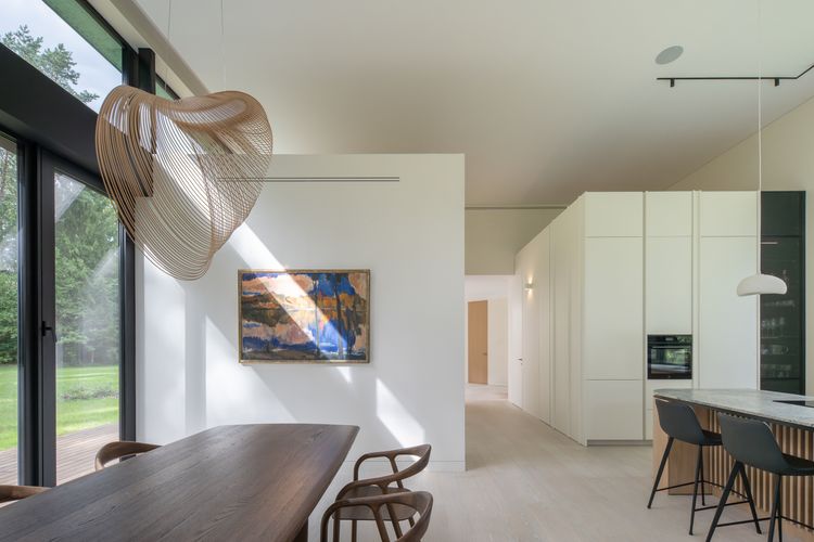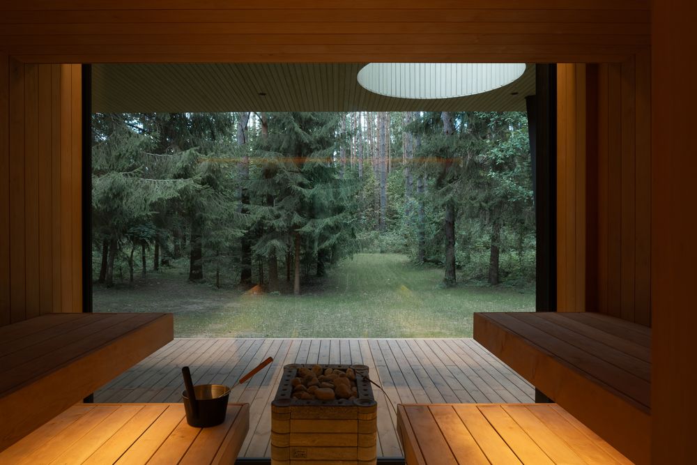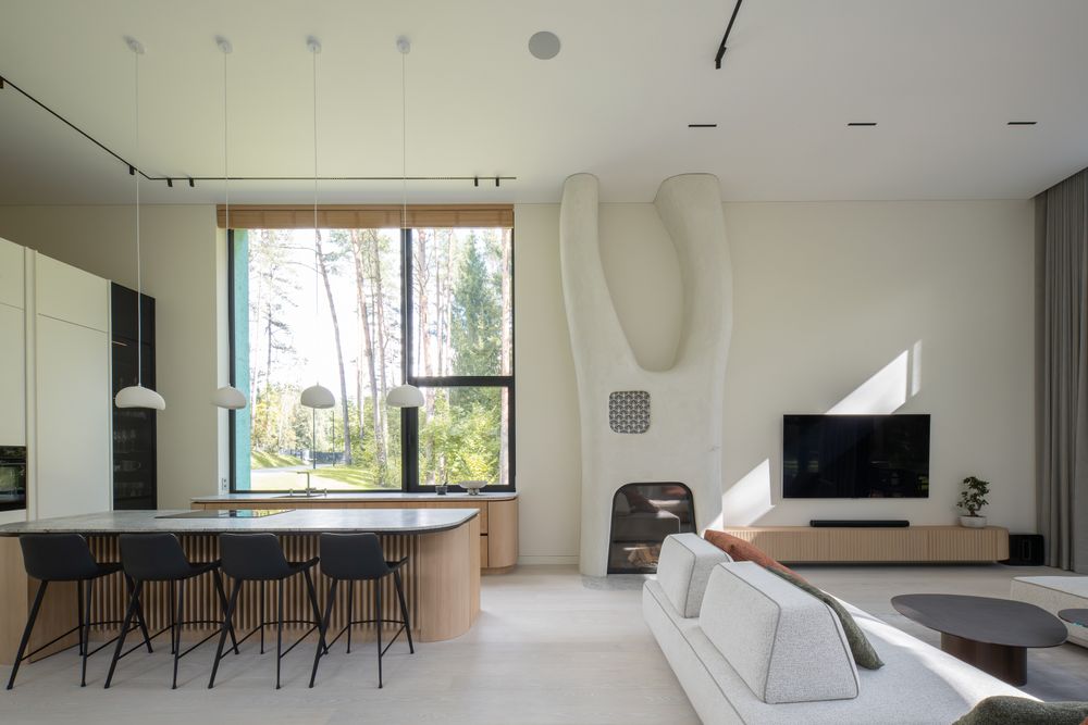 Architecture studio Prusta created this home for a young family as a unified vision of architecture and interior – from concept to completion. Nestled among tall pines, the house was born from a sensitive dialogue with nature. Precise sunlight simulations defined the placement of windows and skylights, allowing natural light to fill the spaces throughout the year. The high living room volume forms a counterbalance to the surrounding pines, opening uninterrupted views of the forest. The interior is an integral continuation of the architecture, with façade materials extending inward – patinated brass, monolithic canopies, and a play of light and shadow. A fireplace, designed by the architect and sculpted by Danas Aleksa, becomes the sculptural centerpiece of the home. Set slightly apart, the sauna pavilion preserves the views from the living area and opens toward the quiet forest, merging seamlessly with nature.