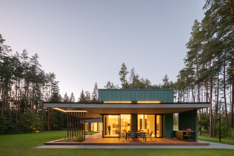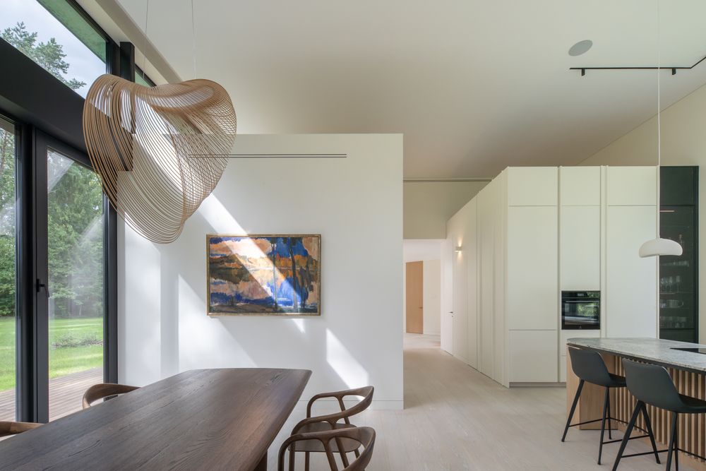 Architektūros studija „Prusta“ sukūrė šį namą kaip vieningą architektūros ir interjero viziją – nuo koncepcijos iki įgyvendinimo. Įkurdintas tarp aukštų pušų, namas gimė iš jautraus santykio su gamta. Atliekant saulės šviesos skaičiavimus, suplanuoti langai ir stoglangiai, kad natūrali šviesa sklistų visais metų laikais. Aukšta svetainės erdvė tapo atsvara dangų remiančioms pušims, leisdama mėgautis nesuskaidytais gamtos vaizdais pro didžiulius langus. Interjeras – nedaloma architektūros tąsa, kur fasado medžiagos pereina į vidų: oksiduotas žalvaris, monolitiniai stogeliai, šviesos ir šešėlio žaismas. Pagal architektės idėją skulptoriaus Dano Aleksos kurtas židinys tampa plastine erdvės dominante. Šiek tiek atokiau įkomponuota pirtis neužstoja vaizdų iš svetainės, o jos langai atsiveria į ūksmingą mišką, leisdami visiškai susilieti su gamta.