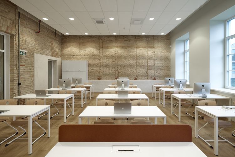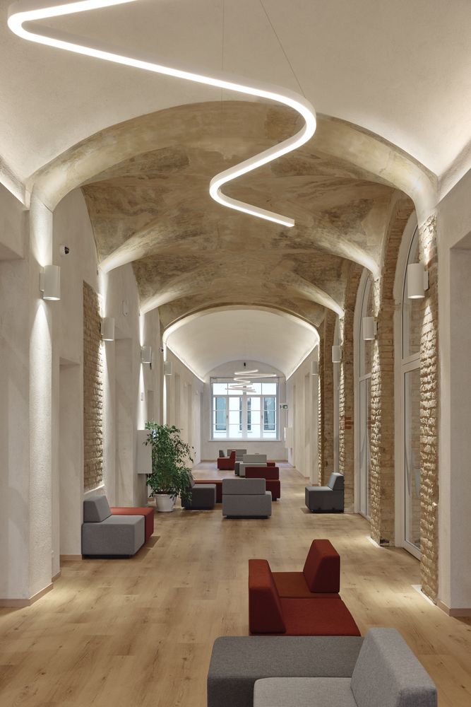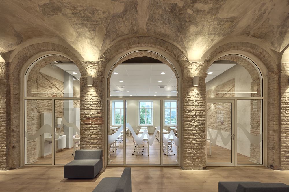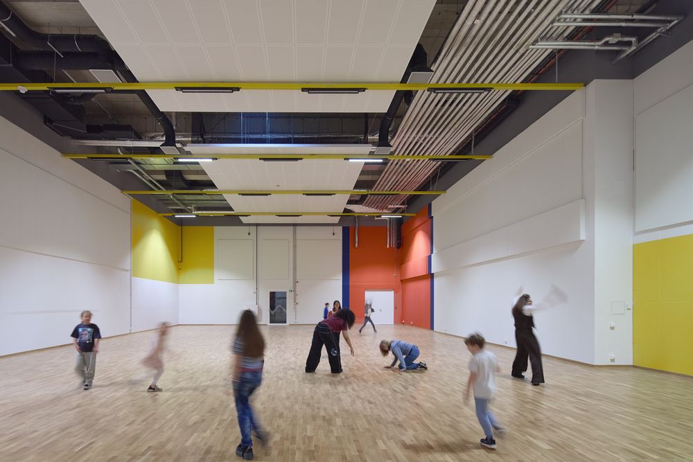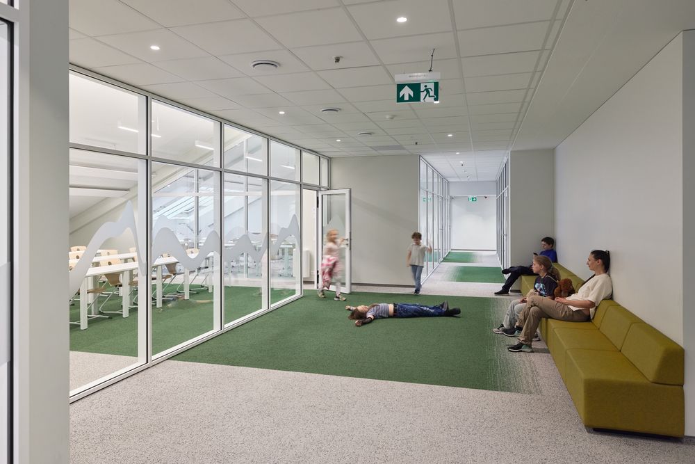 The 3100 m² environment is designed as a living organism: classrooms connect with shared zones, an amphitheater and a color laboratory. Glass walls open views to the river and courtyard, linking the school with its community. The design’s core is the „Wave of Music,“ embodying the school’s identity. Colors are adapted to different ages: vibrant for the youngest, calming for older students. Even restrooms use color as an emotional language to spark curiosity. Walls tell stories – exposed stone and brick, lime plaster and authentic traces. Architecture here is part of education itself: it shapes spaces while nurturing creativity, community and the courage to be oneself.