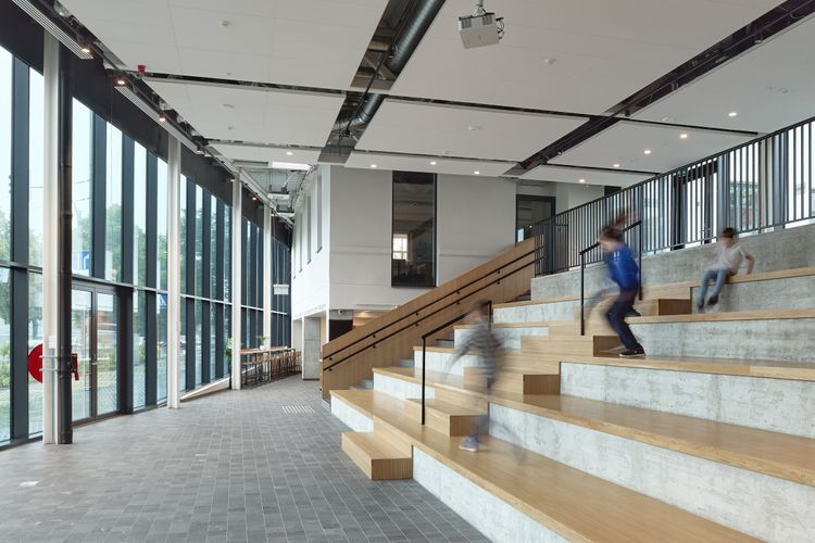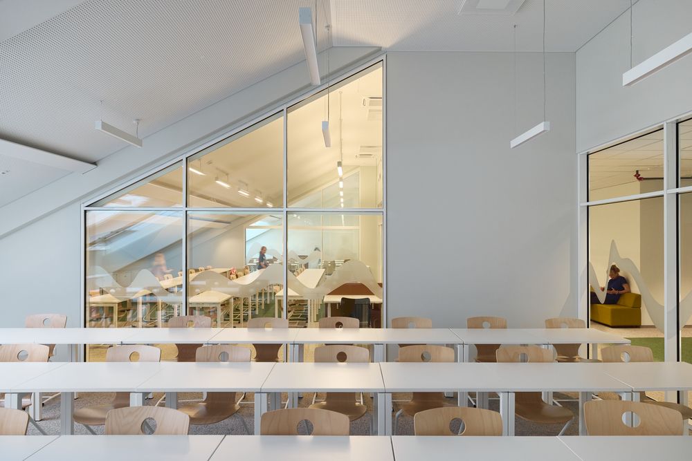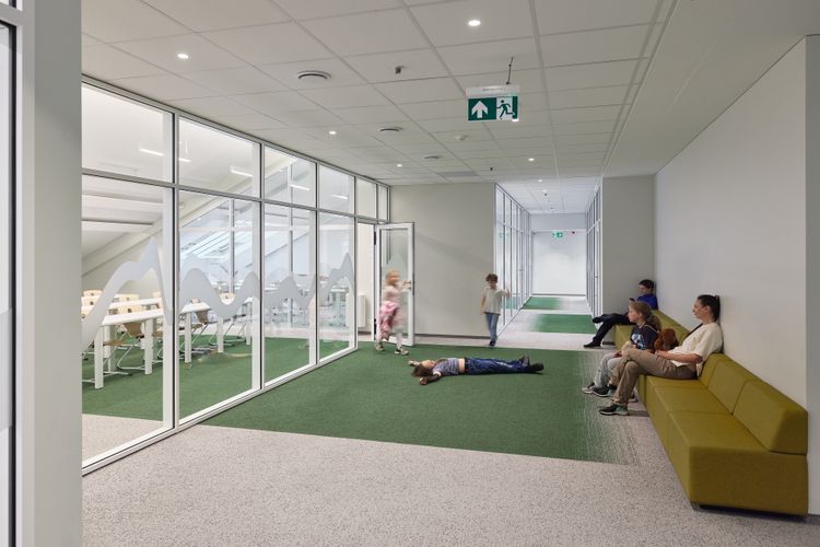 3100 kv. m erdvė sukurta kaip gyvas organizmas: klasės jungiasi su bendromis zonomis, amfiteatru ir spalvų laboratorija. Per stiklines sienas atsiveria vaizdai į upę ir kiemą, todėl mokykla tampa bendruomenės dalimi. Interjero ašis – „Muzikos banga“, įkūnijanti mokyklos identitetą. Spalvos pritaikytos skirtingam amžiui: mažiesiems – energija, vyresniems – ramybė. Net sanitarinėse patalpose spalva naudojama kaip emocinė kalba, ugdanti smalsumą. Sienos pasakoja istoriją – atidengti riedulių mūro ir plytų fragmentai, kalkinis tinkas, autentiški pėdsakai. Architektūra tampa ugdymo dalimi: ji formuoja erdves, bet kartu ir lavina kūrybiškumą, bendruomeniškumą bei drąsą būti savimi.