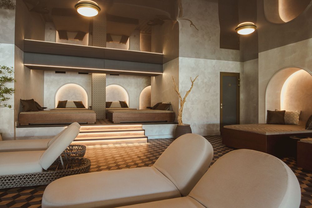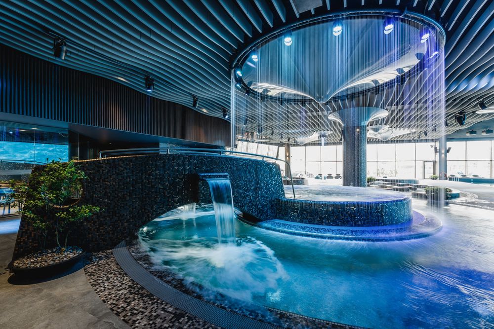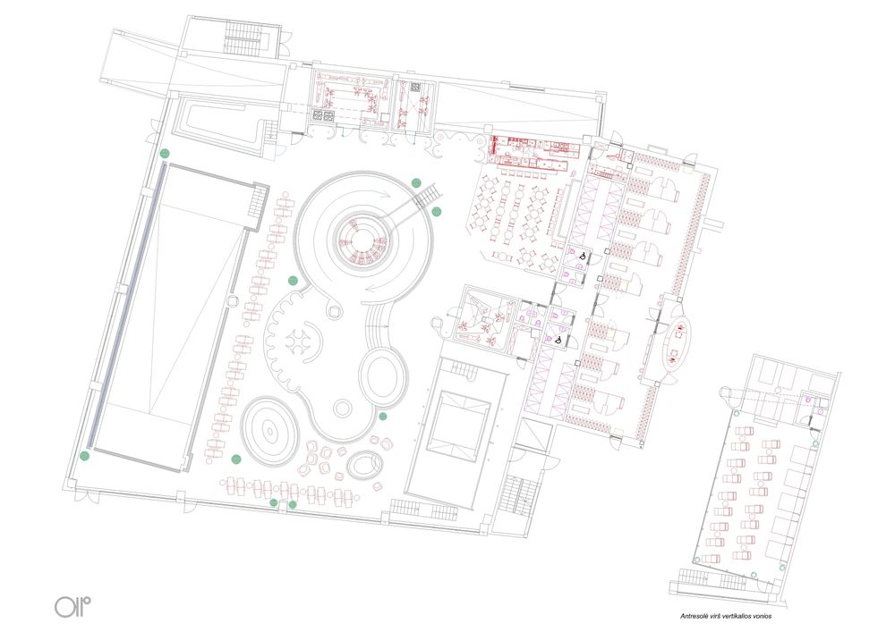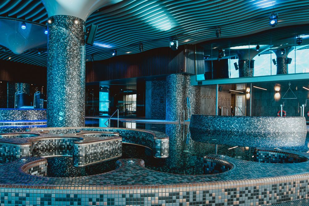 The most exclusive part of the new building of the GRADIALI sanatorium in Palanga, built in 2023-2025, is the swimming pool and sauna area. This 1,700 m² area consists of a 25 m long 3-lane swimming pool, a vertical bath for therapeutic procedures, an entertainment pool with cascades and underwater currents, 3 whirlpools, a children's pool, an indoor hot mineral water pool, 3 different types of saunas, a cafe and an indoor quiet relaxation area. One of the most striking accents of this space is the 25 m long high-definition screen installed along the edge of the swimming pool. The common space is equipped with the highest level of stage lighting and sound, which, synchronized with the screen images and the cascades installed in the ceiling, allow you to create extraordinary light, video, sound and water shows. As a counterbalance to the bright screen images and their reflections on the water and glass surfaces, sufficiently dark materials were chosen for the interior decoration, and various shades of gray were warmed up with dark brown wood trim, copper-colored mosaic accents and green plants. Object: GRADIALI sanatorium swimming pool and sauna area Address: Vanagupės g. 15, Palanga