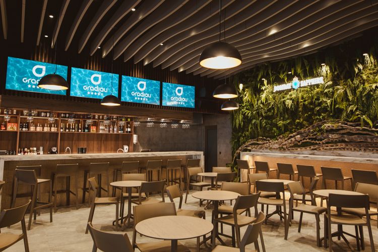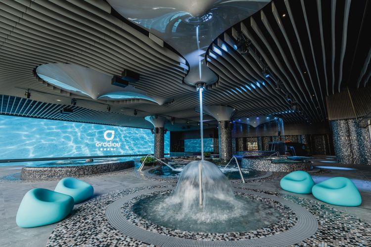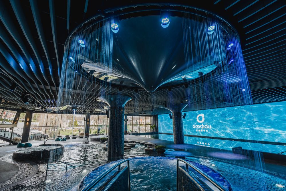 Sanatorijos „Gradiali“ Palangoje 2023-2025 metais pastatyto naujojo korpuso išskirtiniausia dalis - baseinų ir pirčių erdvę. Šią 1700 m² ploto erdvę sudaro 25 m ilgio 3 takų plaukimo baseinas, gydomųjų procedūrų verikali vonia, pramoginis baseinas su kaskadomis ir povandeninėmis srovėmis, 3 sūkurinės vonios, vaikų baseinėlis, uždaras karšto mineralinio vandens baseinas, 3 skirtingų tipų pirtys, kavinė ir uždara tylaus poilsio zona. Vienu ryškiausių šios erdvės akcentu tapo palei plaukimo basino kraštą sumontuotas 25 m ilgio aukštos raiškos ekranas. Bendroje patalpoje įrengtas aukščiausio lygio sceninis apšvietimas bei įgarsinimas, kurie sinchronizuoti su ekrano vaizdais bei lubose įrengtomis kaskadomis leidžia kurti nepaprastus šviesų, vaizdo, garso ir vandens pramoginius renginius. Kaip atsvara ryškiems ekrano vaizdams bei jų atspindžiams vandens ir stiklų paviršiuje, interjero apdailai buvo pasirinktos pakankamai tamsių spalvų medžiagos, o įvairių atspalvių pilkos spalvos sušildytos tamsiai rudos spalvos medžio apdaila, vario spalvos mozaikos akcentais bei žalios spalvos augalais. Objektas: GRADIALI sanatorijos baseinų ir pirčių erdvė Adresas: Vanagupės g. 15, Palanga