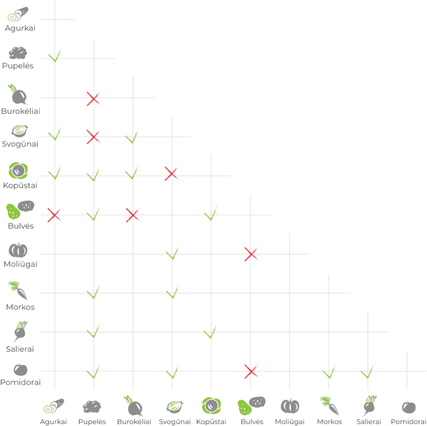 Sėjamieji žirniai, salotos, česnakai, porai, svogūnai, pomidorai, ridikėliai, ridikai, pastarnokai, česnakai, pupelės, pupos